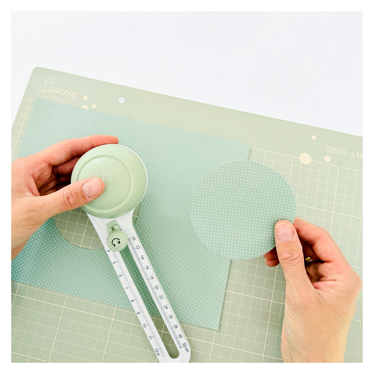 Unser Kreisschneider in Profiqualität ist ein vielseitiges Werkzeug, das sich hervorragend für Deine Bastelprojekte, die individuelle Gestaltung von Fotos Deiner Lieben und auch ideal für Dein nächstes Scrapbooking-Projekt eignet. Durch einen Schieberegler mit Feststellschraube, der sich stufenlos auf die gewünschte Größe einstellen lässt, weist der Kreisschneider eine hohe Präzision auf. Kreise mit einem Durchmesser von 7,5 – 33 cm lassen sich mühelos schneiden. Papier, Fotos und auch Pappe bis zu einer Grammatur von 300 gr/m² stellen für den Kreisschneider kein Problem dar. Der Fixierkopf ist mit einem rutschhemmenden Silikonfuß versehen. Durch dieses spezielle Design wird ein Beschädigen des verwendeten Materials durch ärgerliches „Anpiksen“ des Kreisschneiders verhindert. Das Produkt wird mit zwei Ersatzklingen und einer „Schutzkappe“, die sich im integrierten Aufbewahrungsfach befinden, geliefert. Mit Hilfe der sog. „Schutzkappe“, einem speziellen Sicherheitswerkzeug, lassen sich die Klingen leicht austauschen. Diese sorgen aufgrund ihrer hohen Qualität für eine dauerhafte Schneidleistung. Durch den beidseitigen Schliff der Klingen ist der Kreisschneider sowohl für Rechts- als auch Linkshänder geeignet. Der Kreisschneider von Loveria Artcraft eröffnet Dir durch seine enorme Anpassungsfähigkeit eine breite Palette von vielseitigen Anwendungen. Eröffne Dir neue Möglichkeiten für Deine kreativen Projekte!
