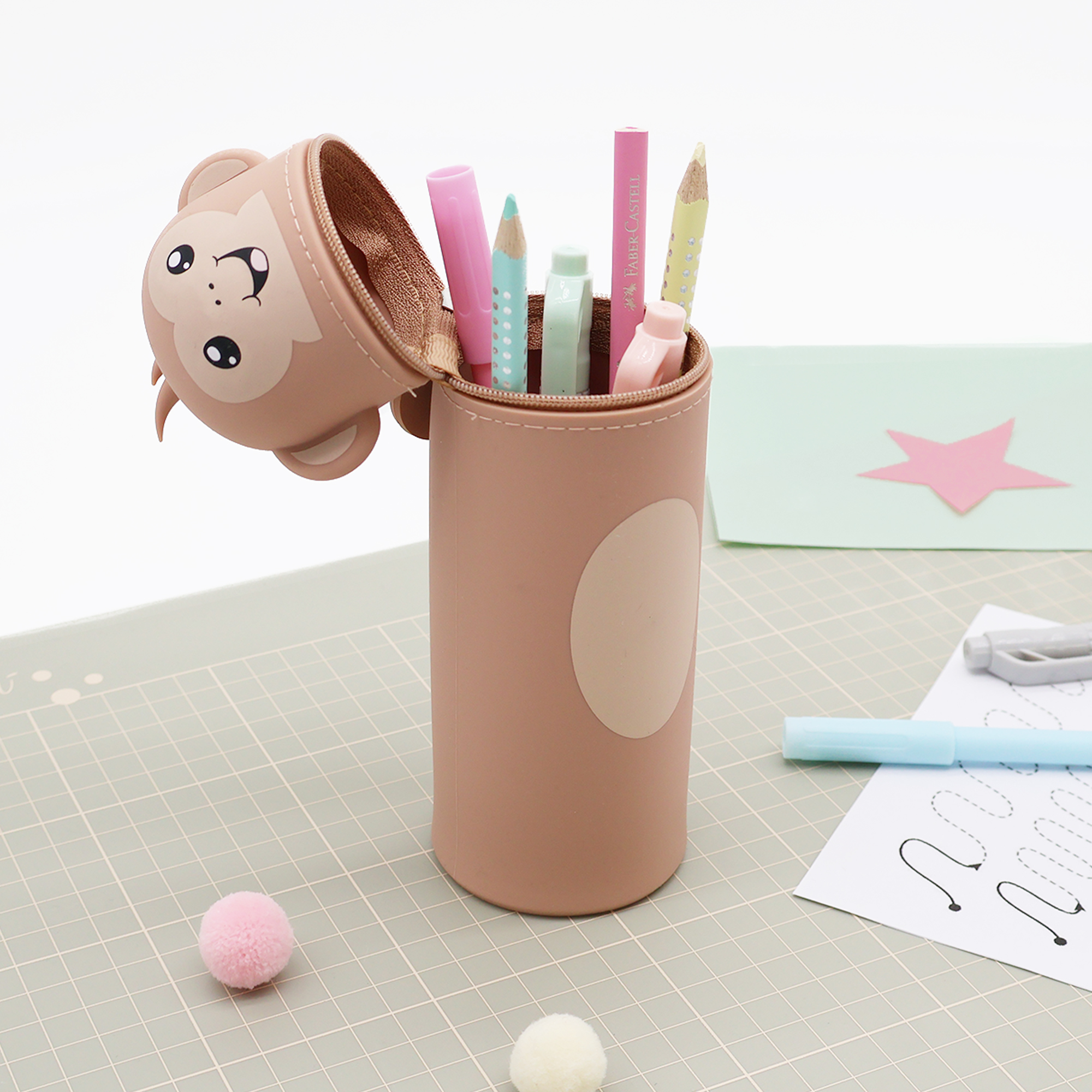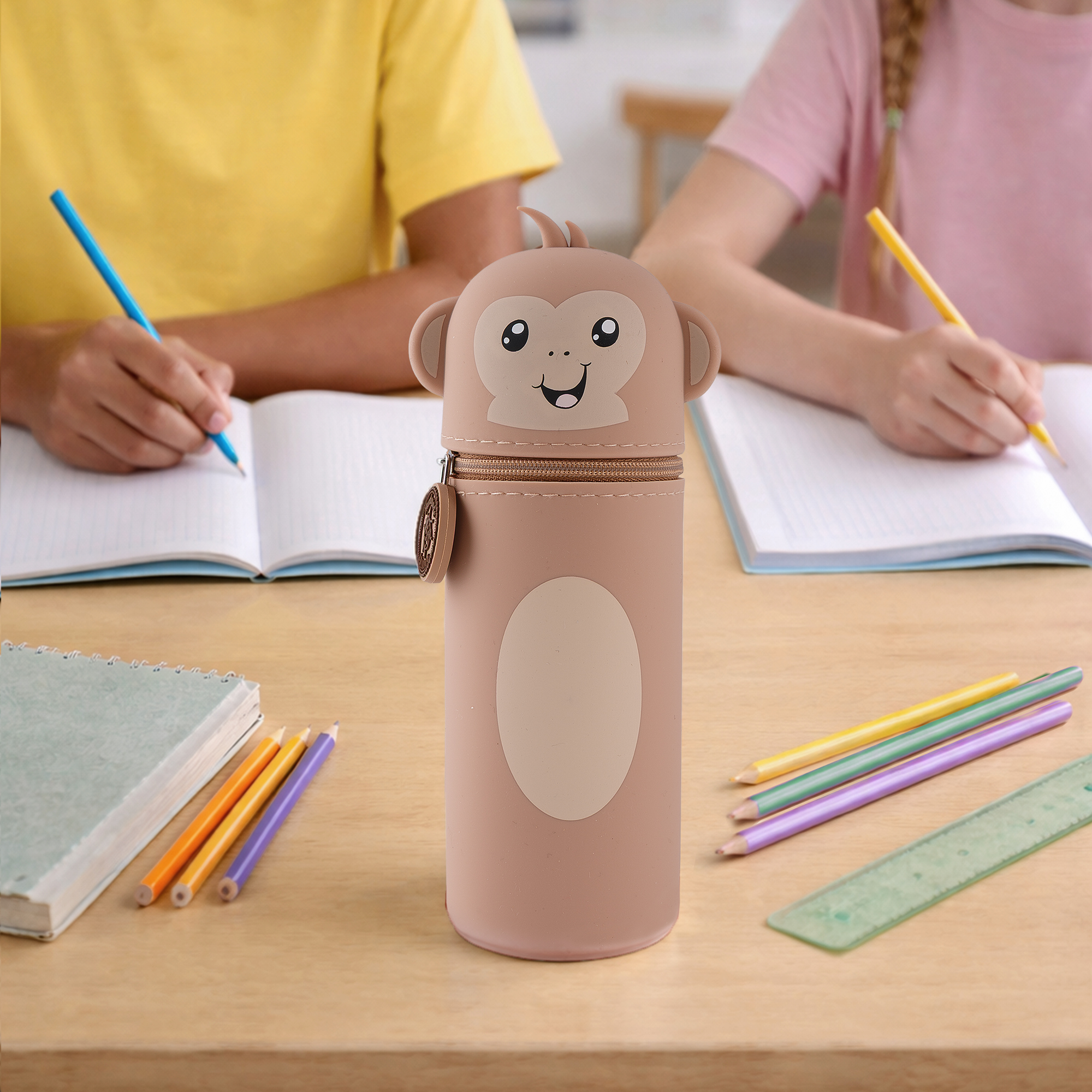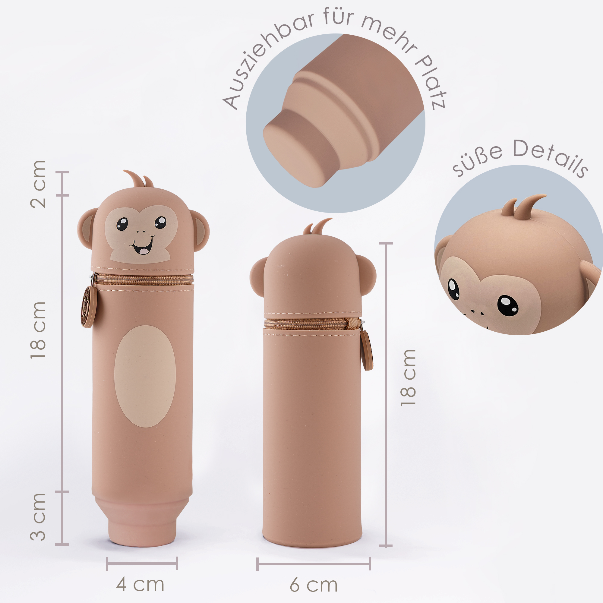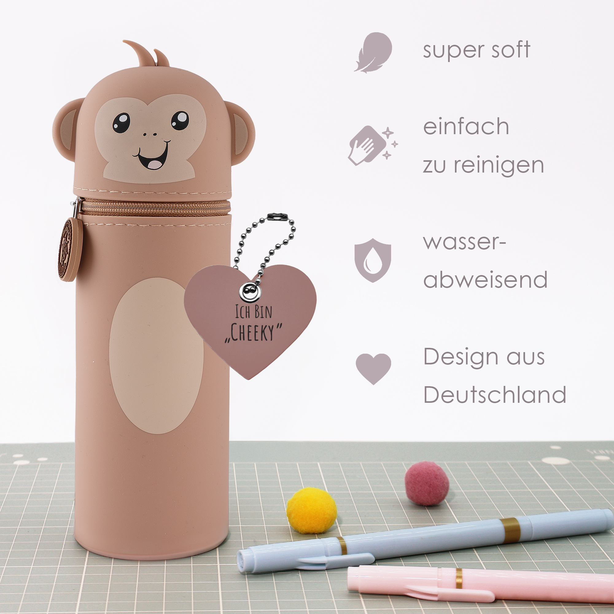 Entdecke unser lustiges Tiermäppchen und finde eine ideale Aufbewahrungsmöglichkeit für alle Deine Lieblingsstifte und Schreibutensilien. Hergestellt aus hochwertigem Silikon ist das Mäppchen strapazierfähig und abwaschbar und eignet sich somit besonders für einen langlebigen täglichen Gebrauch. Dank seines einzigartigen Designs kann es aufrecht stehen, was Dir jederzeit einen unkomplizierten und schnellen Zugang zu Deinen Stiften ermöglicht und Deinen Arbeitsplatz in der Schule oder Zuhause ordentlich hält. Ein stabiler Reißverschluss sorgt dafür, dass alle Schreibutensilien auch dann sicher aufbewahrt werden, wenn Dein Mäppchen im Schulranzen eine Pause einlegt. Zusätzlich hängt am Reißverschluss, befestigt an einem kleinen Kettchen, ein zauberhafter Herzanhänger. Dieser ist auf der einen Seite beschriftet mit „Ich bin Cheeky“, auf der anderen steht „Pass gut auf mich auf! Ich gehöre zu: ___“, hier kann der stolze Besitzer seinen Namen eintragen. So wird das Mäppchen schnell zum persönlichen Lieblingsstück und lässt sich im Klassenzimmer, unterwegs oder zu Hause immer leicht wiederfinden! Mit seinem niedlichen Affen-Motiv ist dieses Mäppchen nicht nur funktional, sondern auch ein toller Blickfang für Schüler jeden Alters. Das Tiermäppchen ist ein ideales Geschenk für alle kleinen und großen Schulkinder! Bringe Funktionalität und eine große Portion Spaß in Deinen Schulalltag mit dem lustigen Affen-Mäppchen aus Silikon!