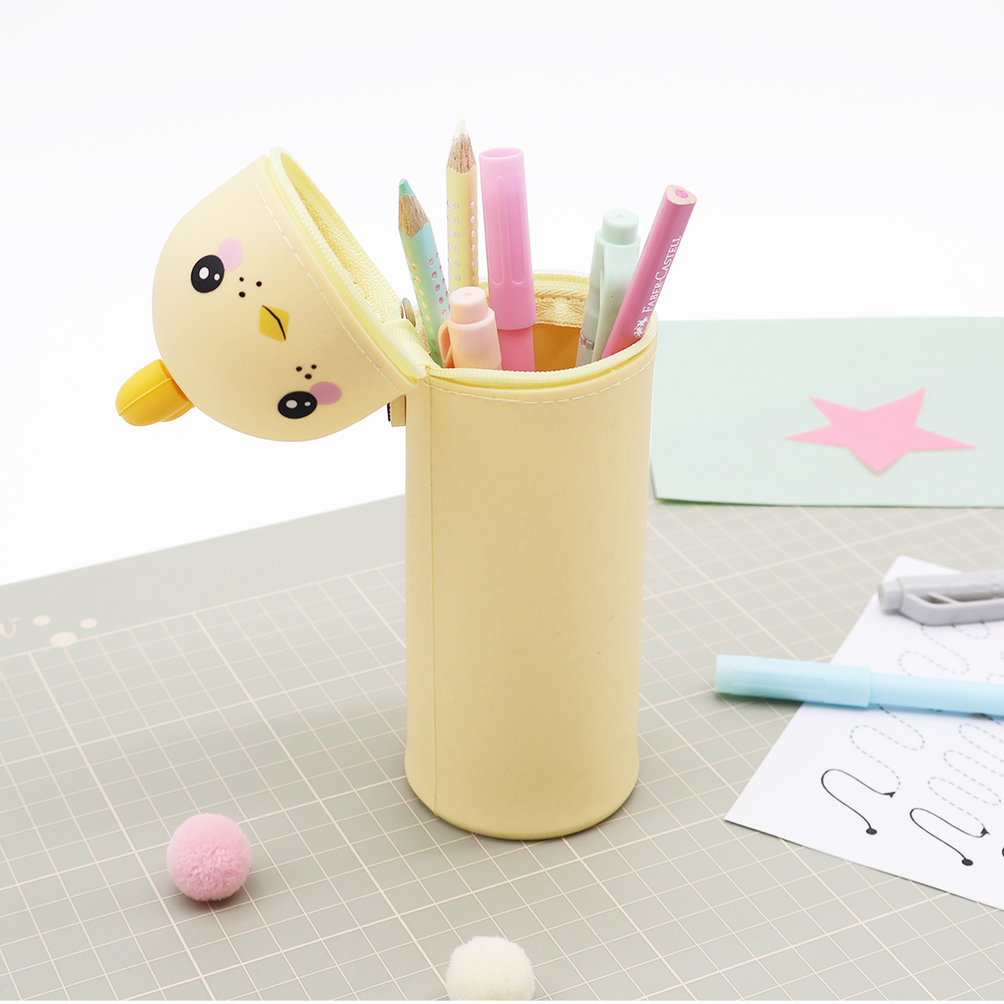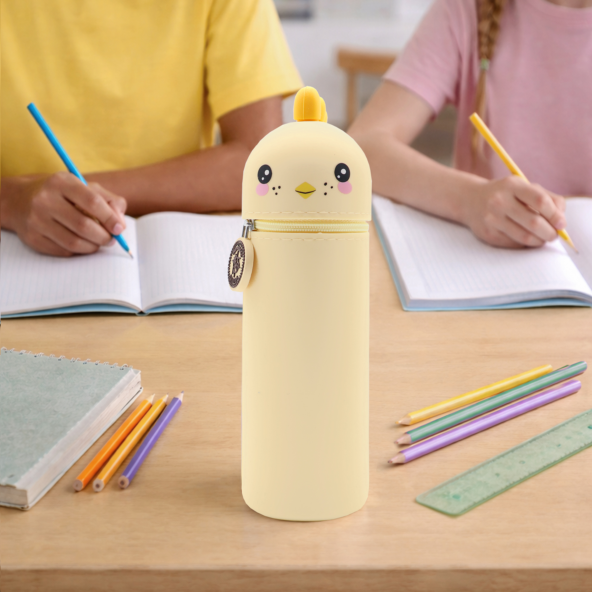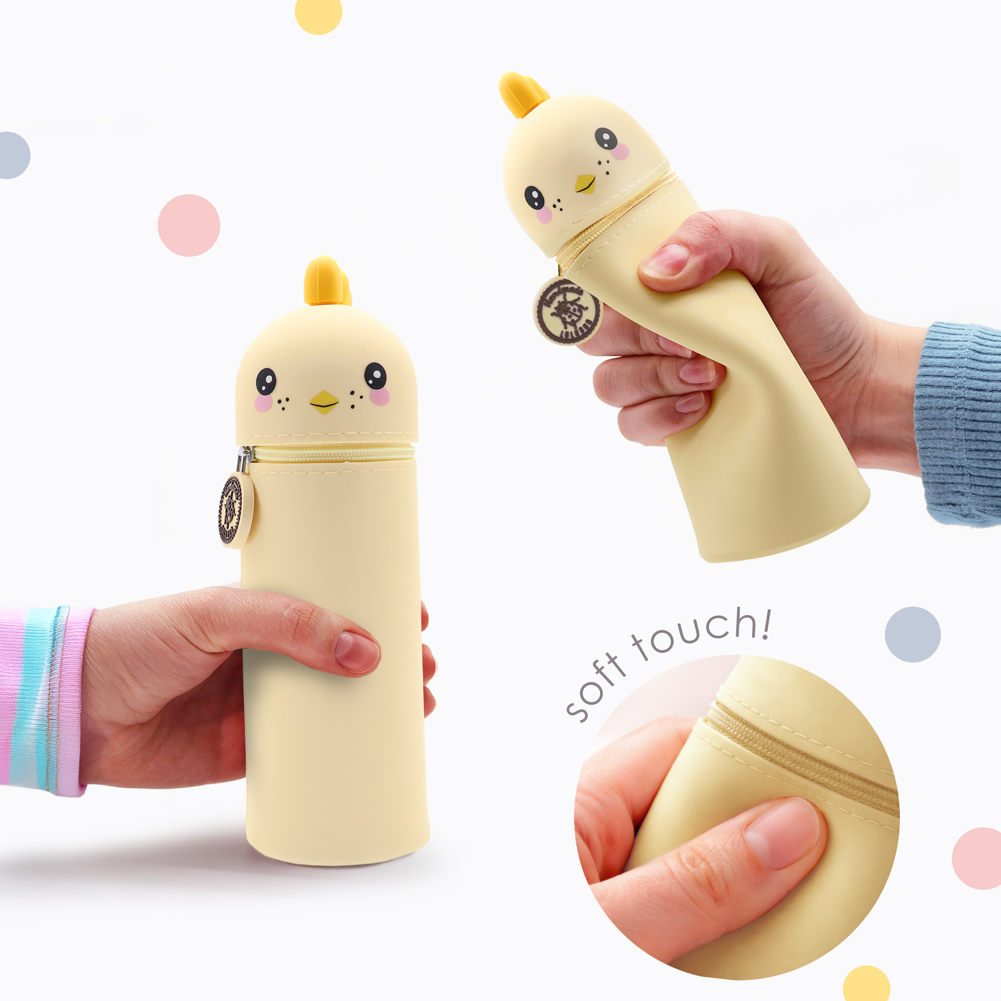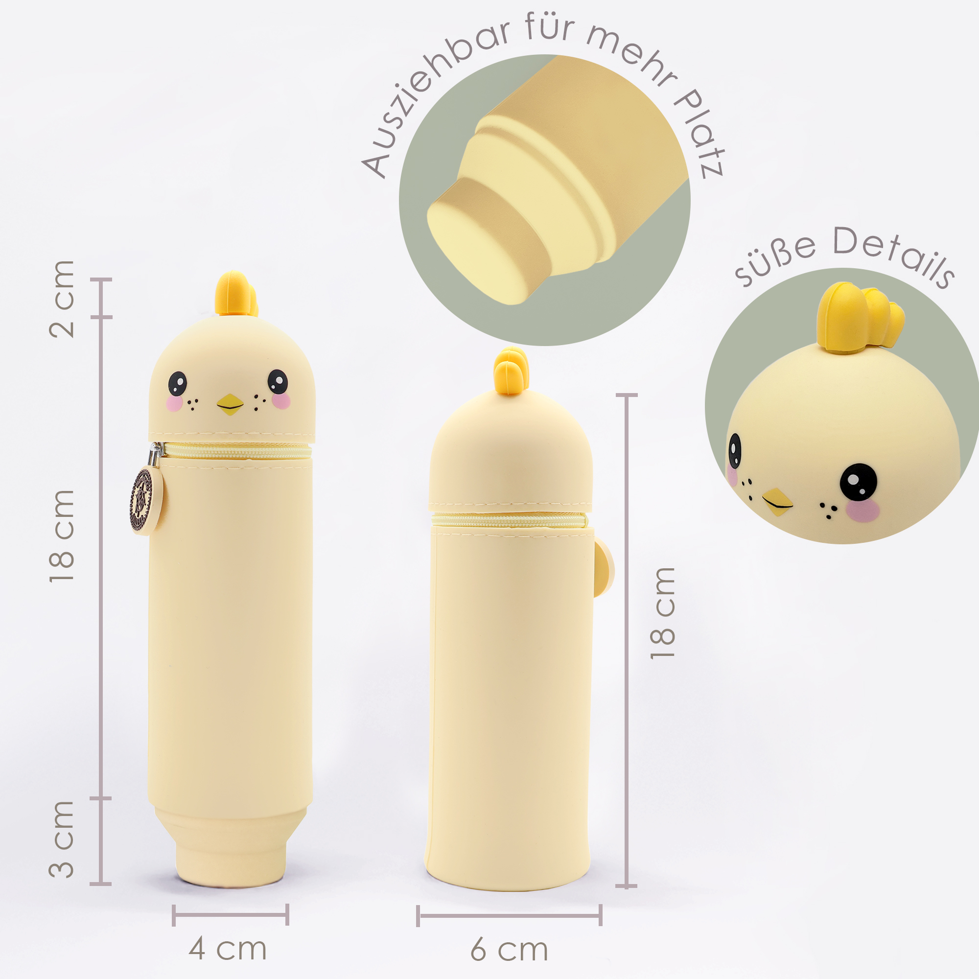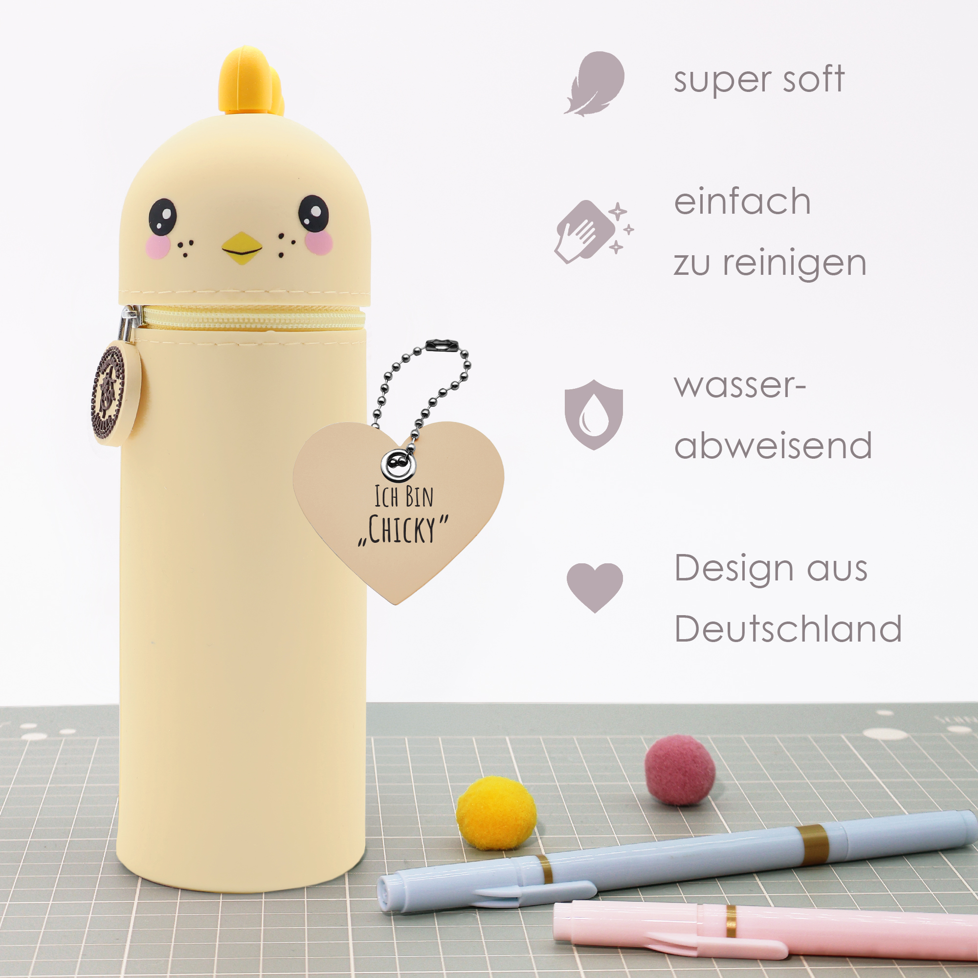 Entdecke unser lustiges Tiermäppchen und finde eine ideale Aufbewahrungsmöglichkeit für alle Deine Lieblingsstifte und Schreibutensilien. Hergestellt aus hochwertigem Silikon ist das Mäppchen strapazierfähig und abwaschbar und eignet sich somit besonders für einen langlebigen täglichen Gebrauch. Dank seines einzigartigen Designs kann es aufrecht stehen, was Dir jederzeit einen unkomplizierten und schnellen Zugang zu Deinen Stiften ermöglicht und Deinen Arbeitsplatz in der Schule oder Zuhause ordentlich hält. Ein stabiler Reißverschluss sorgt dafür, dass alle Schreibutensilien auch dann sicher aufbewahrt werden, wenn Dein Mäppchen im Schulranzen eine Pause einlegt. Zusätzlich hängt am Reißverschluss, befestigt an einem kleinen Kettchen, ein zauberhafter Herzanhänger. Dieser ist auf der einen Seite beschriftet mit „Ich bin Chicky“, auf der anderen steht „Pass gut auf mich auf! Ich gehöre zu: ___“, hier kann der stolze Besitzer seinen Namen eintragen. So wird das Mäppchen schnell zum persönlichen Lieblingsstück und lässt sich im Klassenzimmer, unterwegs oder zu Hause immer leicht wiederfinden! Mit seinem niedlichen Küken-Motiv ist dieses Mäppchen nicht nur funktional, sondern auch ein toller Blickfang für Schüler jeden Alters. Das Tiermäppchen ist ein ideales Geschenk für alle Schulkinder und wird in jeder Schultüte zur lustigen Überraschung! Bringe Funktionalität und eine große Portion Spaß in Deinen Schulalltag mit dem lustigen Küken-Mäppchen aus Silikon!