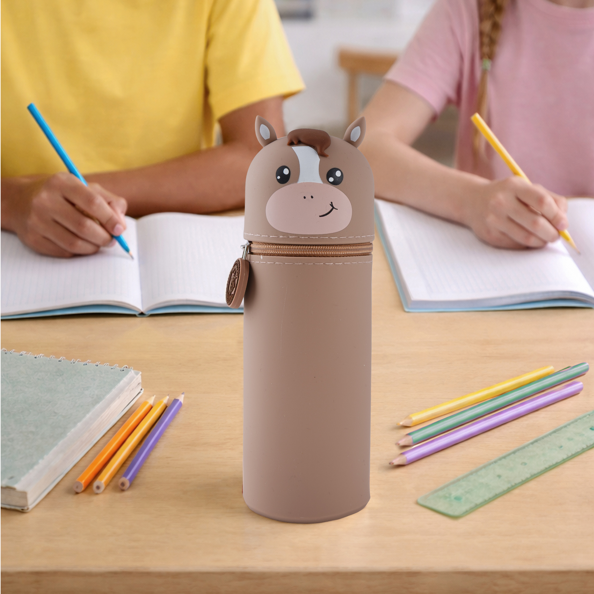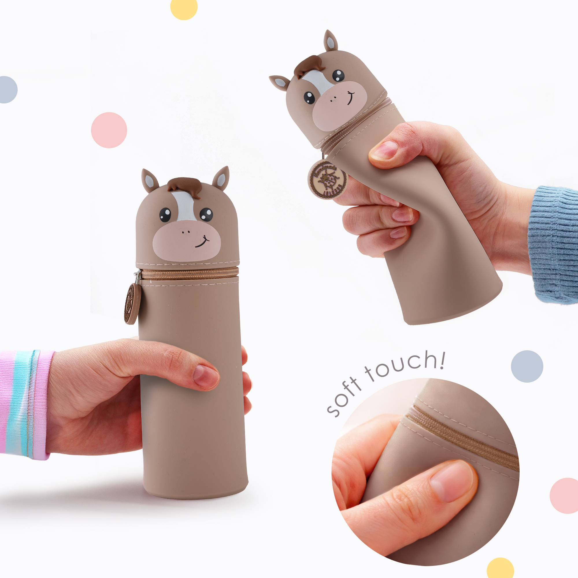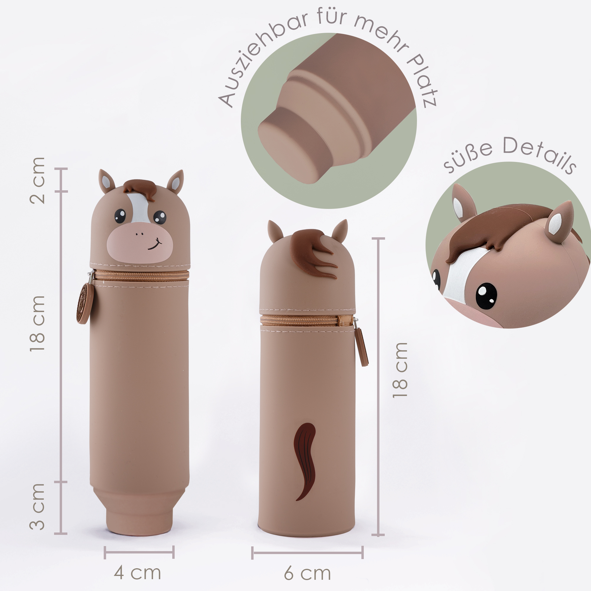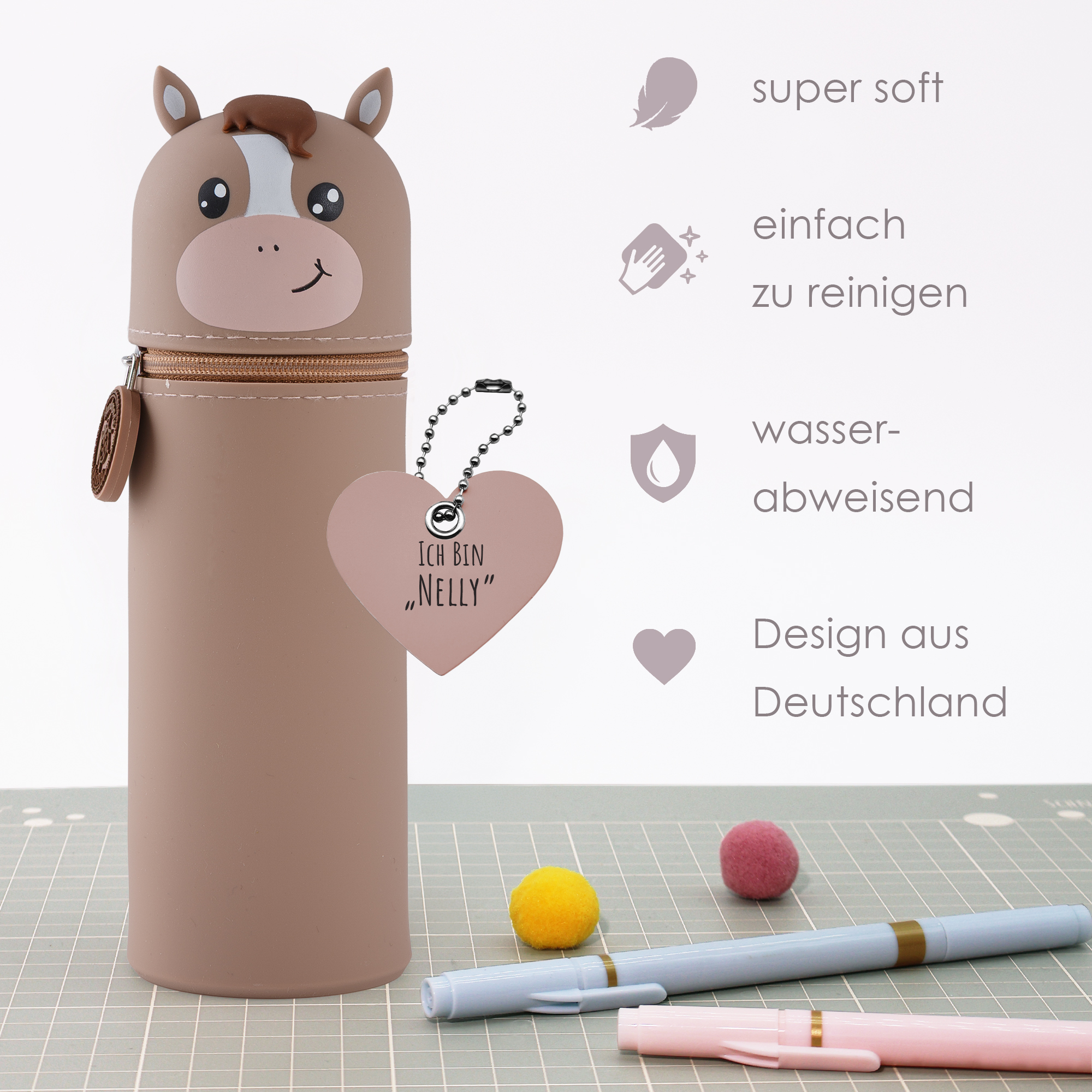 Entdecke unser lustiges Tiermäppchen und finde eine ideale Aufbewahrungsmöglichkeit für alle Deine Lieblingsstifte und Schreibutensilien. Hergestellt aus hochwertigem Silikon ist das Mäppchen strapazierfähig und abwaschbar und eignet sich somit besonders für einen langlebigen täglichen Gebrauch. Dank seines einzigartigen Designs kann es aufrecht stehen, was Dir jederzeit einen unkomplizierten und schnellen Zugang zu Deinen Stiften ermöglicht und Deinen Arbeitsplatz in der Schule oder Zuhause ordentlich hält. Ein stabiler Reißverschluss sorgt dafür, dass alle Schreibutensilien auch dann sicher aufbewahrt werden, wenn Dein Mäppchen im Schulranzen eine Pause einlegt. Zusätzlich hängt am Reißverschluss, befestigt an einem kleinen Kettchen, ein zauberhafter Herzanhänger. Dieser ist auf der einen Seite beschriftet mit „Ich bin Nelly“, auf der anderen steht „Pass gut auf mich auf! Ich gehöre zu: ___“, hier kann der stolze Besitzer seinen Namen eintragen. So wird das Mäppchen schnell zum persönlichen Lieblingsstück und lässt sich im Klassenzimmer, unterwegs oder zu Hause immer leicht wiederfinden! Mit seinem niedlichen Affen-Motiv ist dieses Mäppchen nicht nur funktional, sondern auch ein toller Blickfang für Schüler jeden Alters. Das Tiermäppchen ist ein ideales Geschenk für alle kleinen und großen Schulkinder! Bringe Funktionalität und eine große Portion Spaß in Deinen Schulalltag mit dem lustigen Pferd-Mäppchen aus Silikon!
