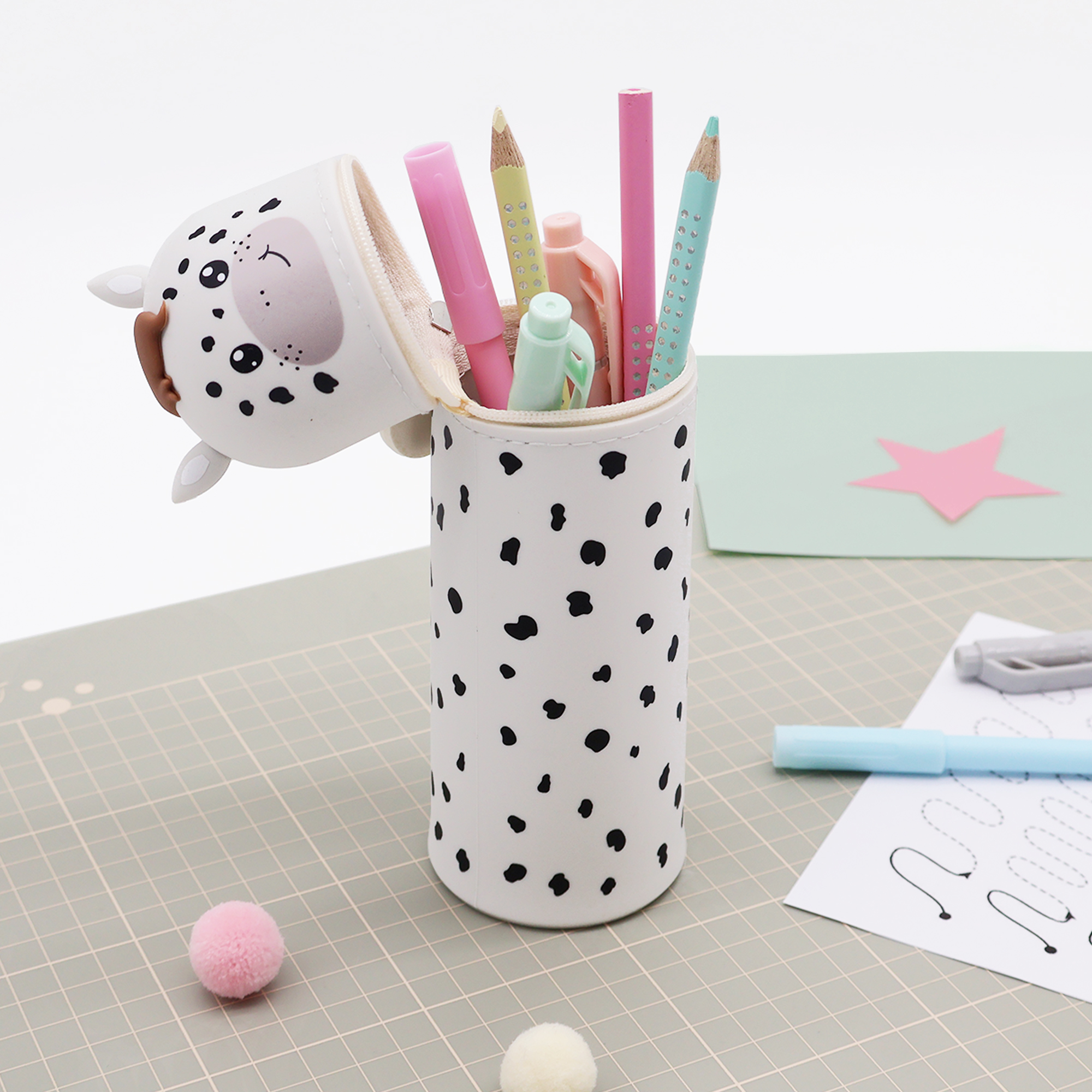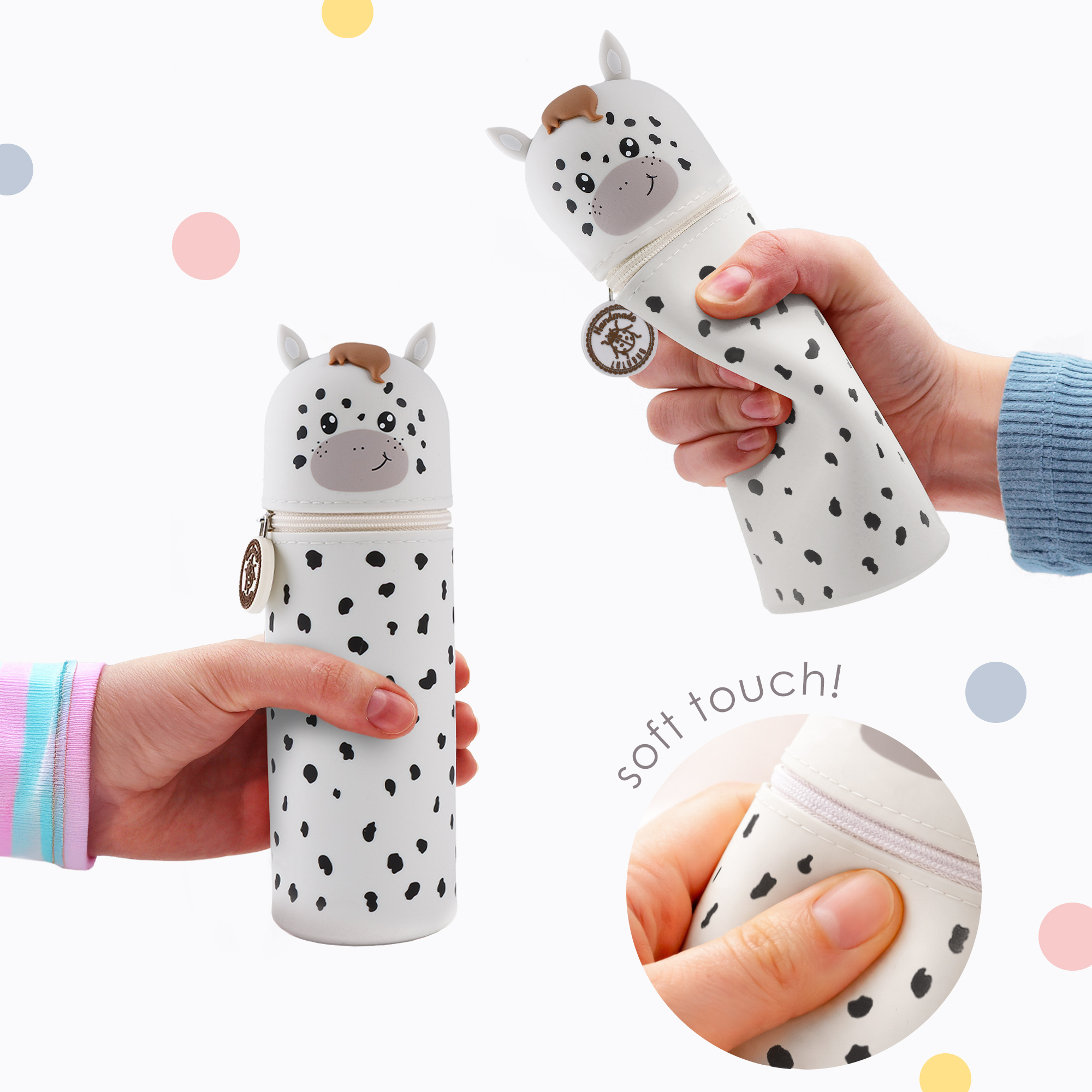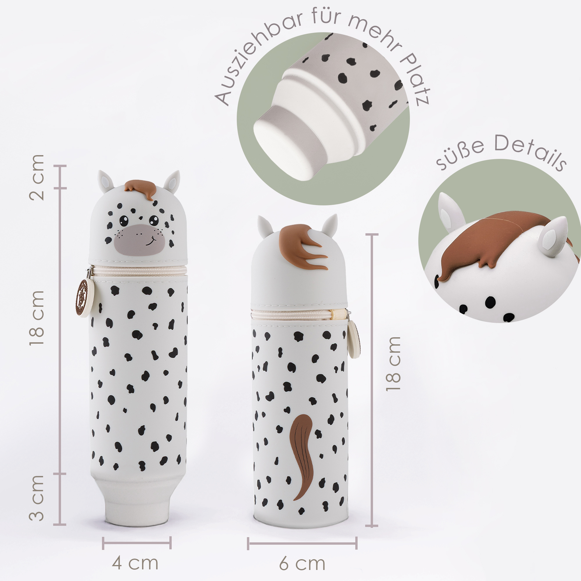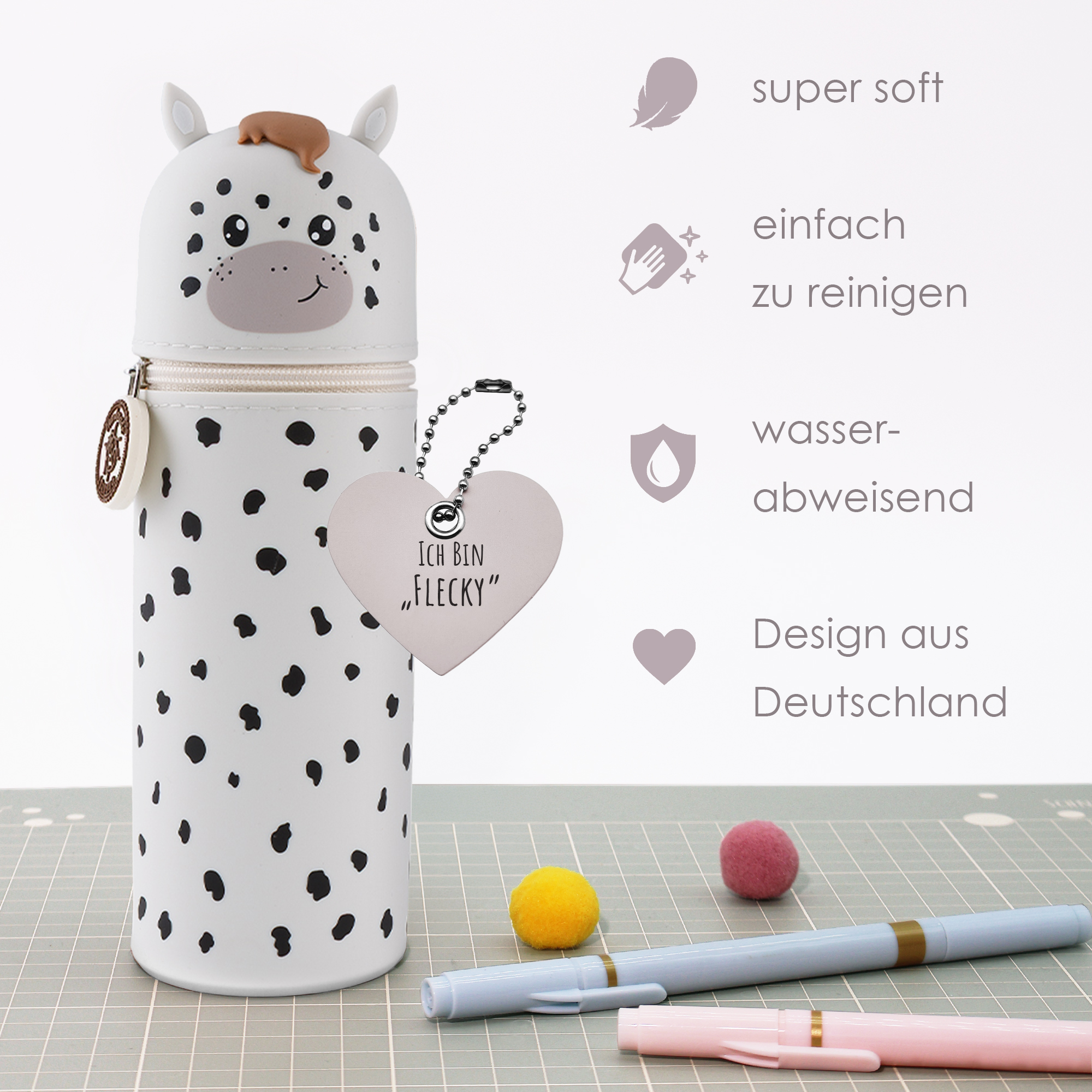 Entdecke unser lustiges Tiermäppchen und finde eine ideale Aufbewahrungsmöglichkeit für alle Deine Lieblingsstifte und Schreibutensilien. Hergestellt aus hochwertigem Silikon ist das Mäppchen strapazierfähig und abwaschbar und eignet sich somit besonders für einen langlebigen täglichen Gebrauch. Dank seines einzigartigen Designs kann es aufrecht stehen, was Dir jederzeit einen unkomplizierten und schnellen Zugang zu Deinen Stiften ermöglicht und Deinen Arbeitsplatz in der Schule oder Zuhause ordentlich hält. Ein stabiler Reißverschluss sorgt dafür, dass alle Schreibutensilien auch dann sicher aufbewahrt werden, wenn Dein Mäppchen im Schulranzen eine Pause einlegt. Zusätzlich hängt am Reißverschluss, befestigt an einem kleinen Kettchen, ein zauberhafter Herzanhänger. Dieser ist auf der einen Seite beschriftet mit „Ich bin Flecky“, auf der anderen steht „Pass gut auf mich auf! Ich gehöre zu: ___“, hier kann der stolze Besitzer seinen Namen eintragen. So wird das Mäppchen schnell zum persönlichen Lieblingsstück und lässt sich im Klassenzimmer, unterwegs oder zu Hause immer leicht wiederfinden! Mit seinem niedlichen Schimmel-Motiv ist dieses Mäppchen nicht nur funktional, sondern auch ein toller Blickfang für Schüler jeden Alters. Das Tiermäppchen ist ein ideales Geschenk für alle kleinen und großen Schulkinder! Bringe Funktionalität und eine große Portion Spaß in Deinen Schulalltag mit dem lustigen Schimmel-Mäppchen aus Silikon!