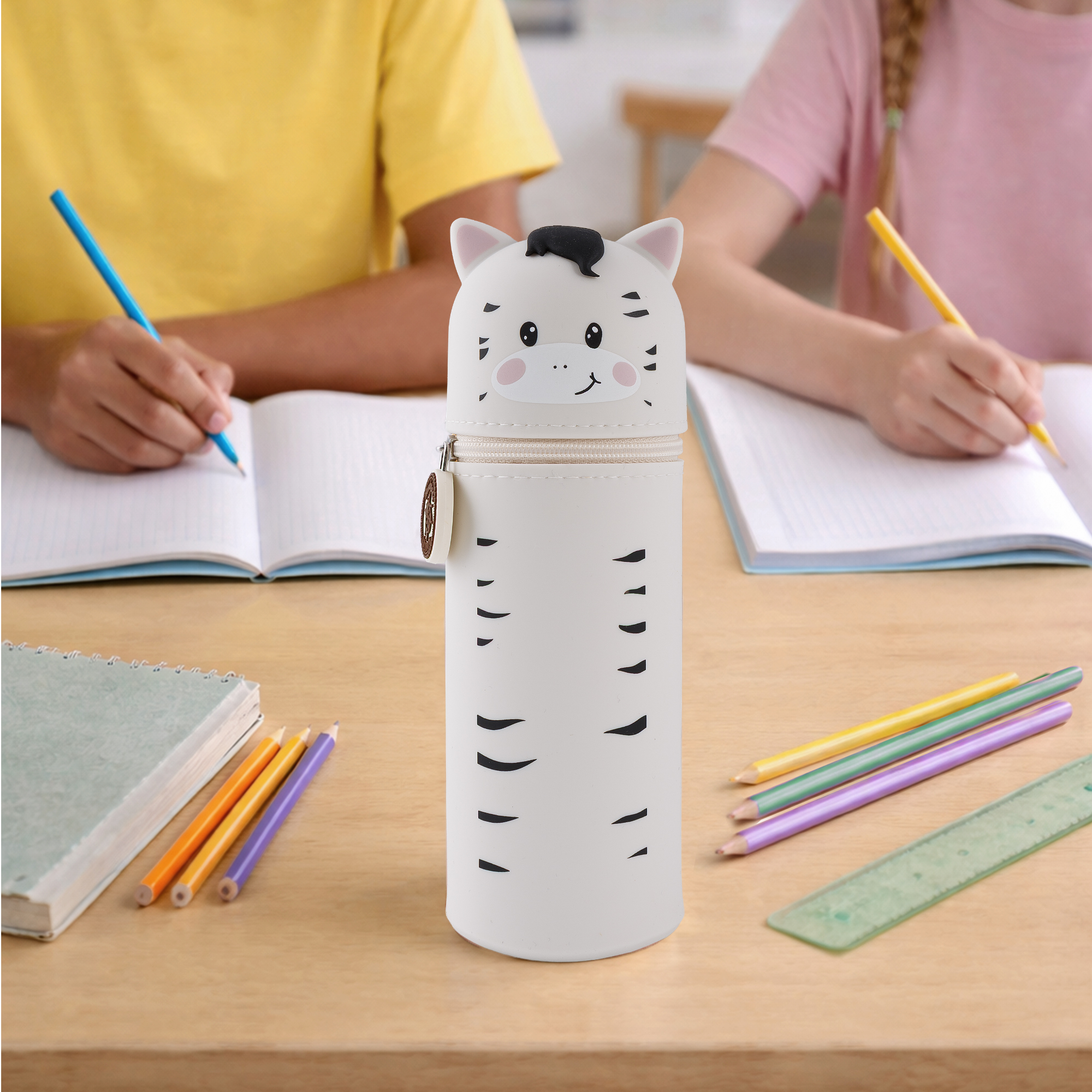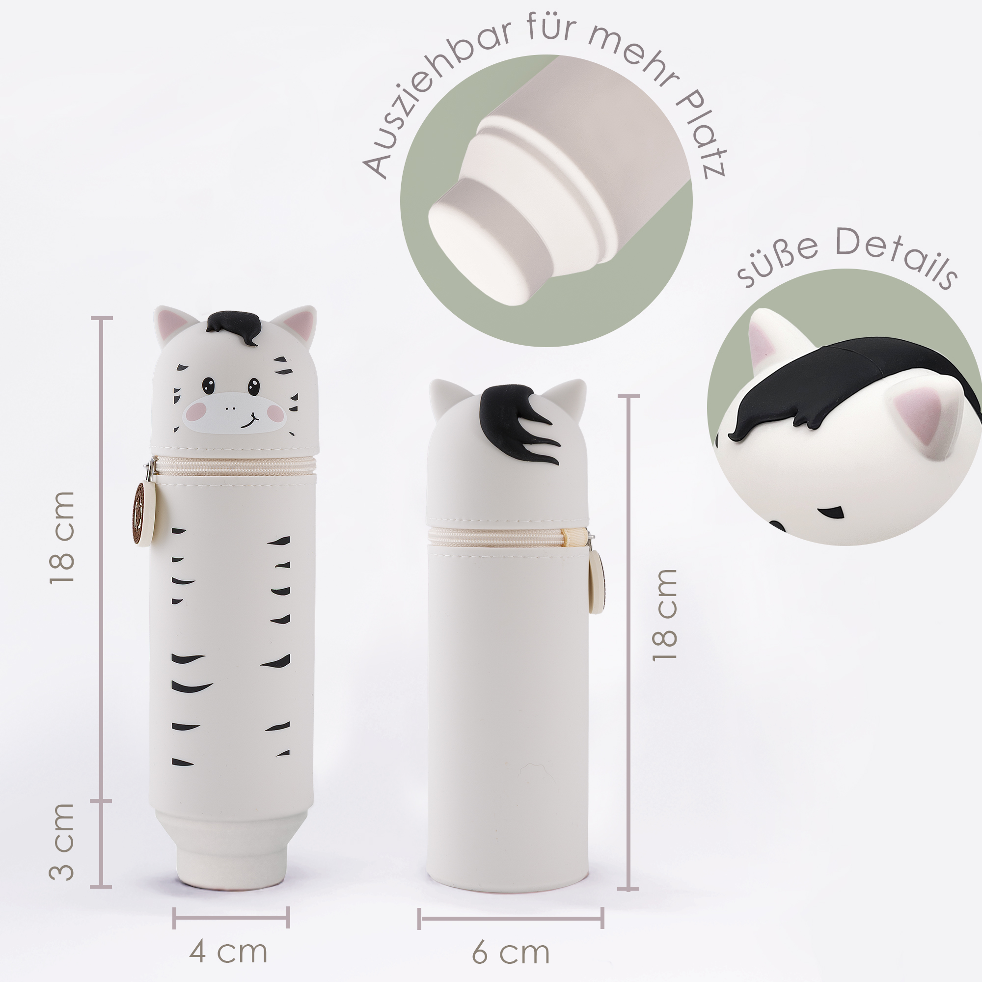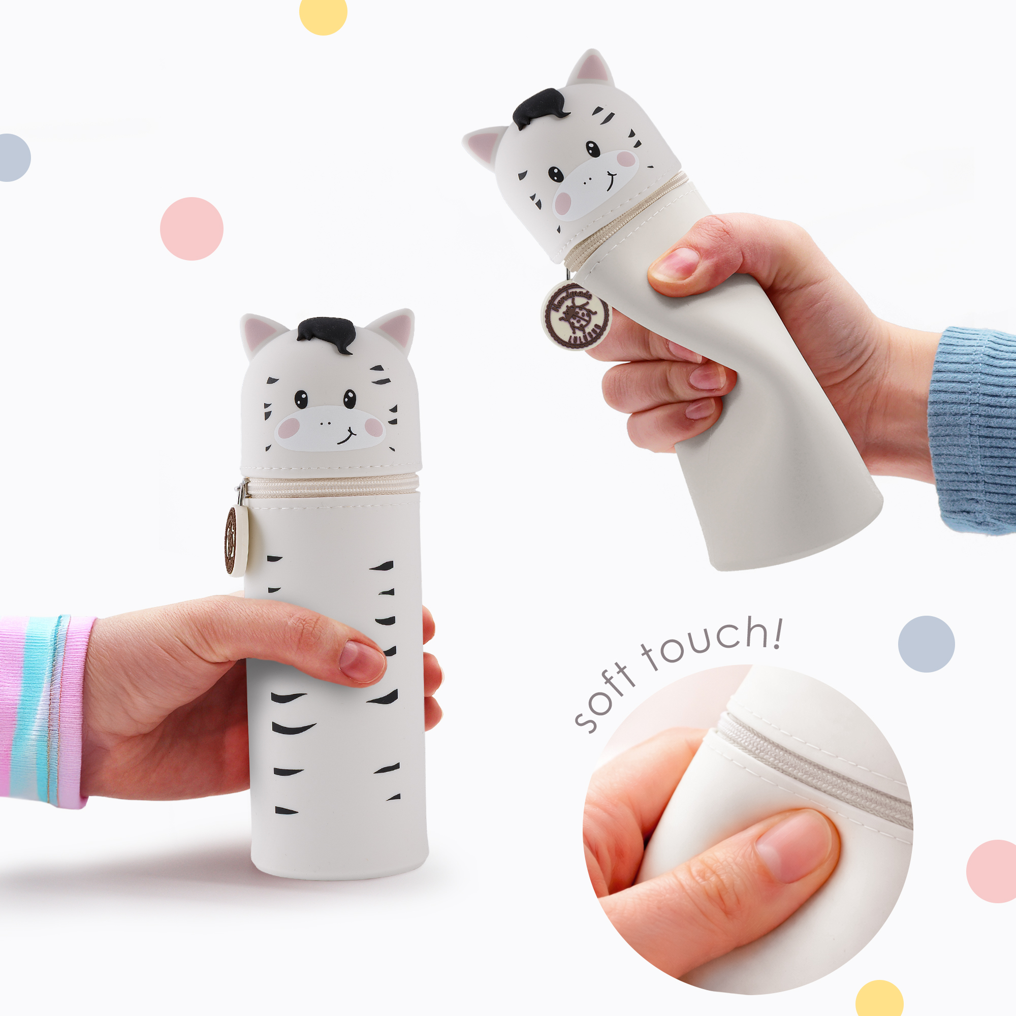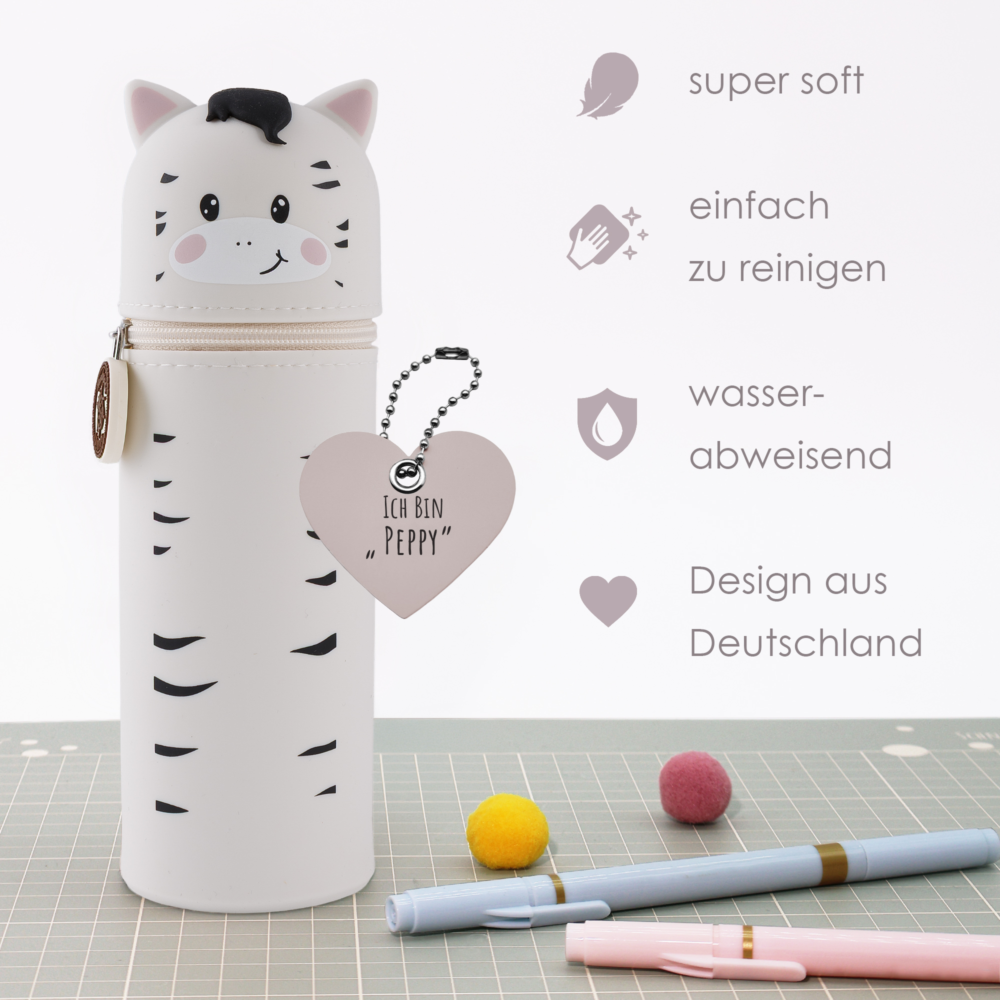 Entdecke unser lustiges Tiermäppchen und finde eine ideale Aufbewahrungsmöglichkeit für alle Deine Lieblingsstifte und Schreibutensilien. Hergestellt aus hochwertigem Silikon ist das Mäppchen strapazierfähig und abwaschbar und eignet sich somit besonders für einen langlebigen täglichen Gebrauch. Dank seines einzigartigen Designs kann es aufrecht stehen, was Dir jederzeit einen unkomplizierten und schnellen Zugang zu Deinen Stiften ermöglicht und Deinen Arbeitsplatz in der Schule oder Zuhause ordentlich hält. Ein stabiler Reißverschluss sorgt dafür, dass alle Schreibutensilien auch dann sicher aufbewahrt werden, wenn Dein Mäppchen im Schulranzen eine Pause einlegt. Zusätzlich hängt am Reißverschluss, befestigt an einem kleinen Kettchen, ein zauberhafter Herzanhänger. Dieser ist auf der einen Seite beschriftet mit „Ich bin Peppy“, auf der anderen steht „Pass gut auf mich auf! Ich gehöre zu: ___“, hier kann der stolze Besitzer seinen Namen eintragen. So wird das Mäppchen schnell zum persönlichen Lieblingsstück und lässt sich im Klassenzimmer, unterwegs oder zu Hause immer leicht wiederfinden! Mit seinem niedlichen Affen-Motiv ist dieses Mäppchen nicht nur funktional, sondern auch ein toller Blickfang für Schüler jeden Alters. Das Tiermäppchen ist ein ideales Geschenk für alle kleinen und großen Schulkinder! Bringe Funktionalität und eine große Portion Spaß in Deinen Schulalltag mit dem lustigen Zebra-Mäppchen aus Silikon!