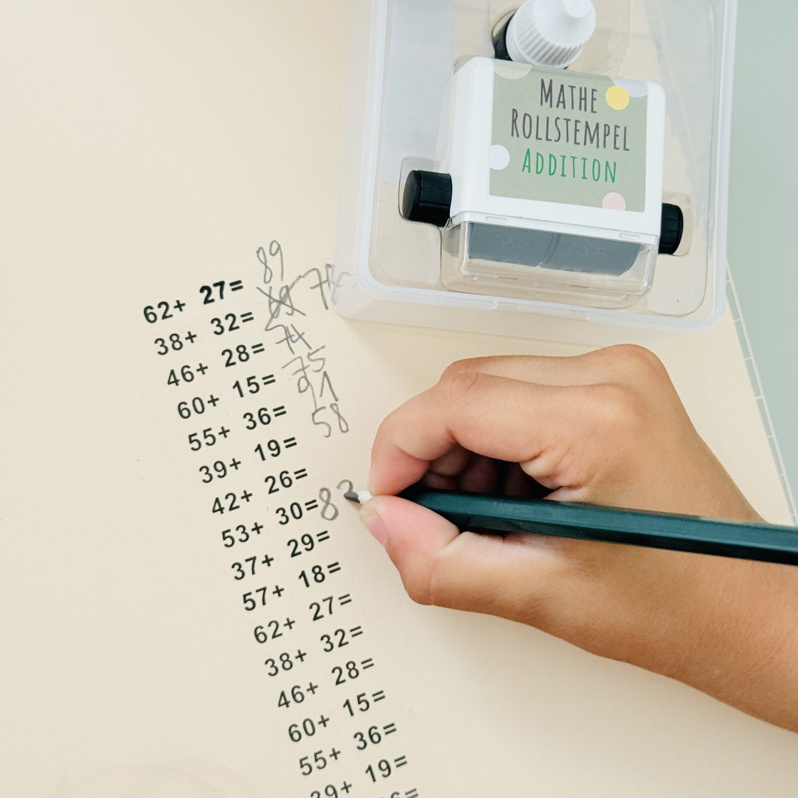 Entdecke unseren Mathe Rollstempel „Addition“ von Lulubug Handmade und hilf Deinem Kind zu einem Mathegenie zu werden. Dieses vielseitige und innovative Lehrmittel wurde entwickelt, um Kindern im Zahlenraum bis 100 dabei zu helfen, die Grundlagen der Mathematik spielerisch zu erfassen. Mit seiner einfachen Handhabung und der Möglichkeit, zwischen 10 verschiedenen Warteschlangenmodi zu wählen, bietet dieser Stempel eine Vielzahl von Lernmöglichkeiten. Dank des leicht einzustellenden Designs – durch einfaches Drehen des Rädchens, das sich seitlich am Stempel befindet – wird eine Wiederholung der Aufgaben verhindert. Dadurch wird sichergestellt, dass Dein Kind kontinuierlich neue Herausforderungen meistern und sein Verständnis von Additionsaufgaben verbessern kann. Der Mathe Rollstempel, in den Maßen 5 x 6 x 3 cm (L x B x T), wird in einer praktischen Aufbewahrungsbox inkl. Nachfülltinte geliefert. Mit einer ergonomischen Gestaltung liegt der Stempel bequem in der Hand und bietet ein reibungsloses Rollen für eine mühelose Anwendung. Der Mathe Rollstempel ist für alle zukünftigen Rechenmeister ein ideales Geschenk. Natürlich passt er auch wunderbar in jede Schultüte. Lass die Zahlen rollen und sieh zu, wie sich Dein Kind in die Welt der Zahlen verliebt!
